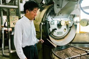サザコーヒーの焙煎機と同社鈴木会長(画像提供/サザコーヒー)