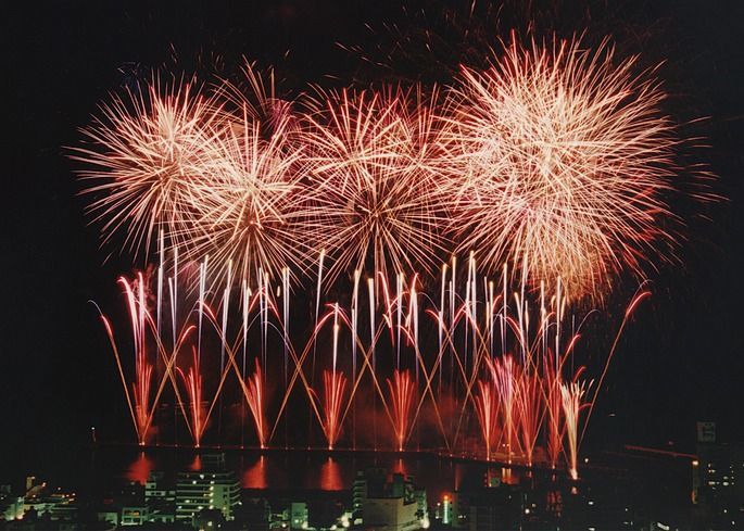 夏以外も開かれる、熱海市の花火大会。打ち上げ会場の熱海湾をアルプススタンド状に市街地が取り囲み、花開くたびに迫力の音響が響く。