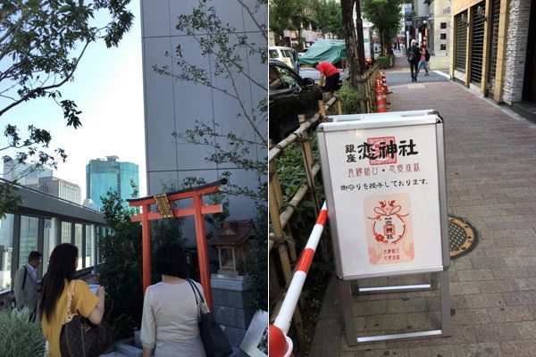 (左)ギンザシックス屋上のかく護神社(右)銀座恋神社の立て看板(画像/著者提供)