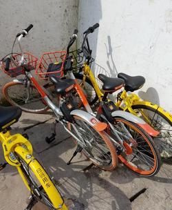黄色い車体がofoでオレンジがモバイク。中国では写真のように街のどこでも乗れて非常に便利だ。広東省広州市内で筆者撮影。