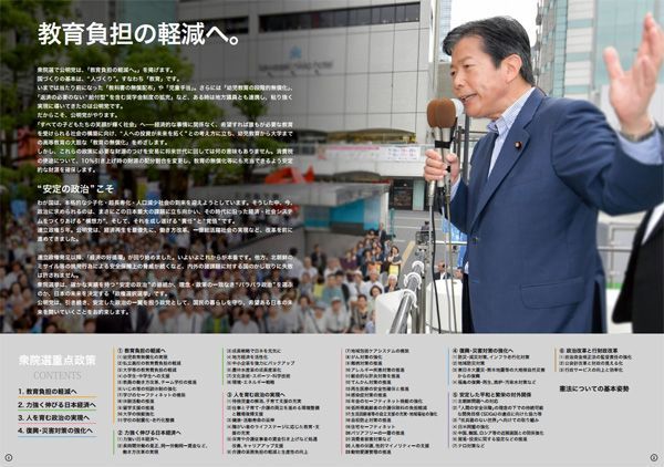 日本維新の会「マニフェスト」の表紙。松井一郎代表の写真は2ページ目に掲載されている。
