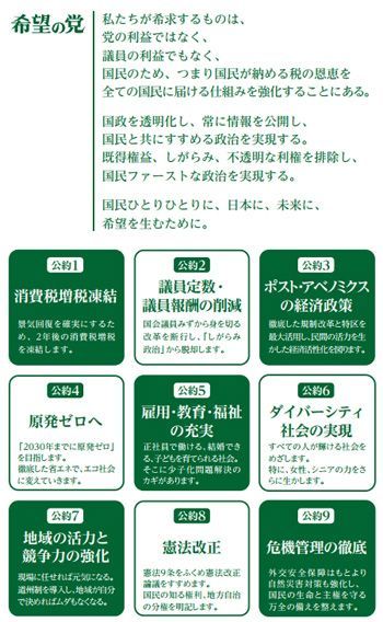 希望の党「政策集」PDFの1ページ目。9つの「公約」が並べられている。