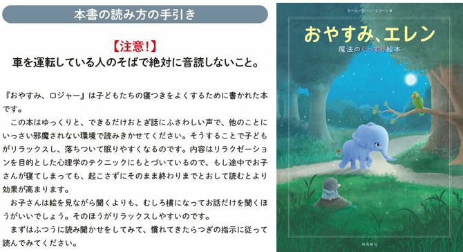 (左)絵本の冒頭にある「本書の読み方の手引き」。大きな文字で「車を運転している人の横で絶対に音読しないこと」とある。(右)ロジャーの続編『おやすみ、エレン』は同じ原作者による絵本。主人公のゾウは、ロジャーのウサギよりちょっとかわいくなっている。