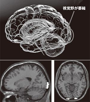(上)面前DVによるマルトリートメントの脳への影響(下)白い部分は容積の減少が見られた視覚野の一部(写真提供=友田明美氏)