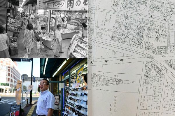 (左上)商店と人でにぎわっていた六本松の新道商店街(1975年8月撮影)(左下)往時を振り返る「光和堂」の大島達男さん(右)大島さんが持っている1965(昭和40)年の六本松周辺の地図。左下の広大な九州大の用地に比べ、そのほかの部分は住宅や店舗がぎっしり並んでいる