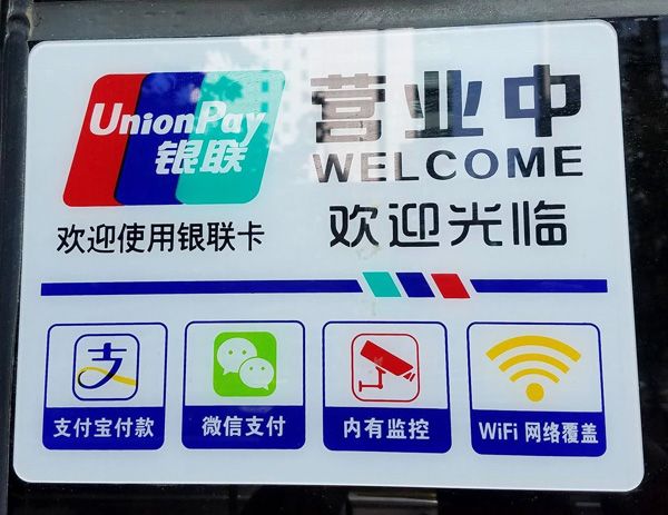 ※スマホ決済の「アリペイ」と「ウィーチャット・ペイ」にそれぞれ対応、Wi-Fi提供中……という3本柱の完備が、近年の中国都市部の飲食店の基本だ。大連市内で筆者撮影。