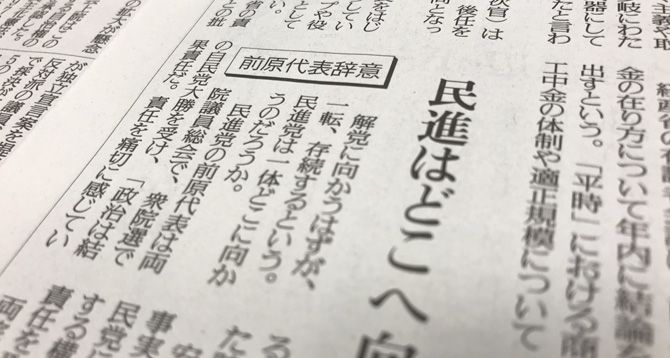 読売新聞の社説(10月28日付)。見出しは「前原代表辞意 民進はどこへ向かうつもりか」。
