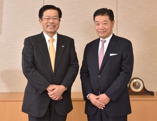 ブラザー工業の小池利和社長(左)とコメダ珈琲店の臼井興胤社長