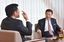 ブラザー工業の小池利和社長(左)とコメダ珈琲店の臼井興胤社長(右)