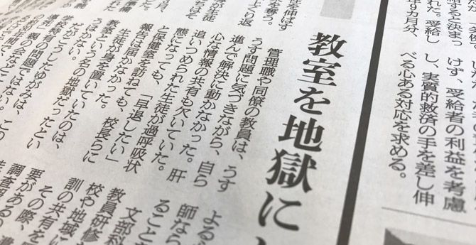 朝日新聞の社説(10月29日付)。見出しは「指導死 教室を地獄にしない」。