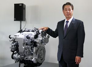 次世代エンジン「スカイアクティブ-X」と小飼雅道・マツダ社長。