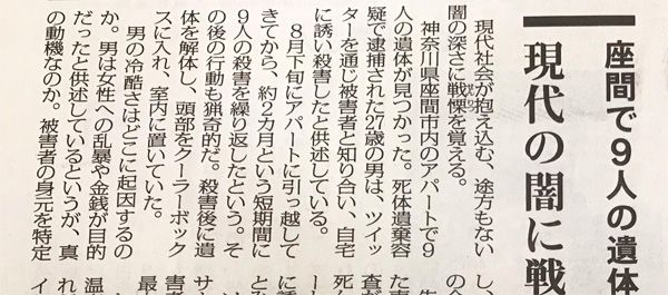 毎日新聞の社説(11月2日付)。見出しは「座間で9人の遺体発見 現代の闇に戦慄を覚える」。