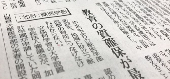読売新聞の社説(11月11日付)。見出しは<「加計」獣医学部 教育の質確保が最優先課題だ>。