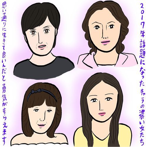 2017年ウラ流行語を発した女性たち。幸福の科学に出家した女優・清水富美加さん(右下)、「つなぎ融資の女王」こと山辺節子被告(左下)、さらに女優の松居一代さん(左上)、元衆議院議員の豊田真由子氏(右上)。(イラスト=辛酸なめ子 以下同)