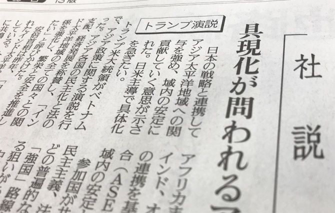 読売新聞の社説(11月11日付)。見出しは「トランプ演説 具現化が問われるアジア戦略」。