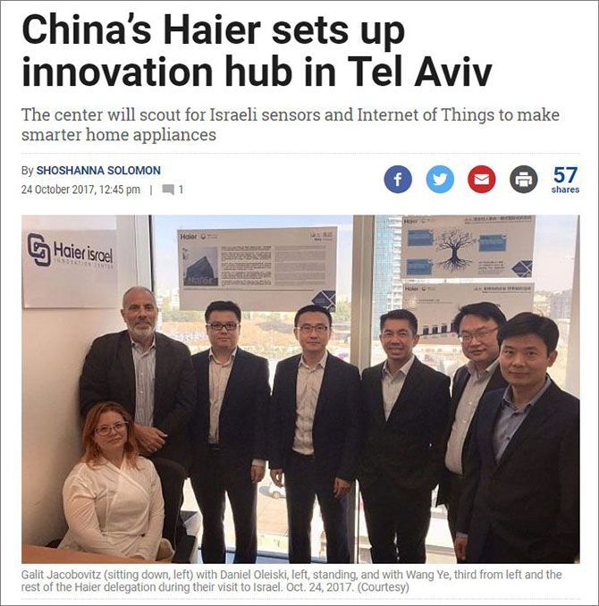 今年10月24日、テルアビブ市内で記念撮影をおこなう中国ハイアールとイスラエル側関係者。『タイムズ・オブ・イスラエル』より。