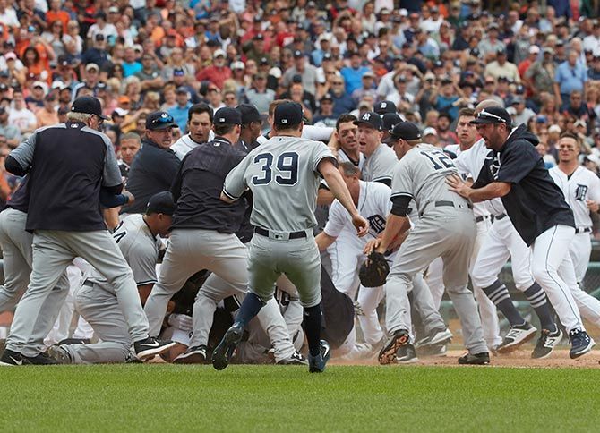 マウンド付近で激しくもみ合う、ニューヨーク・ヤンキースとデトロイト・タイガース両軍の選手。(写真=USA TODAY Sports/ロイター/アフロ)