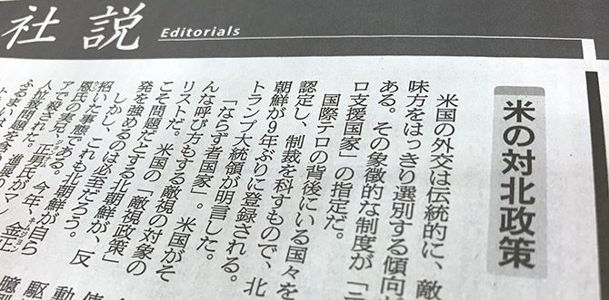 朝日新聞の社説(11月22日付)。見出しは「米の対北政策 敵視だけでは前進せぬ」。