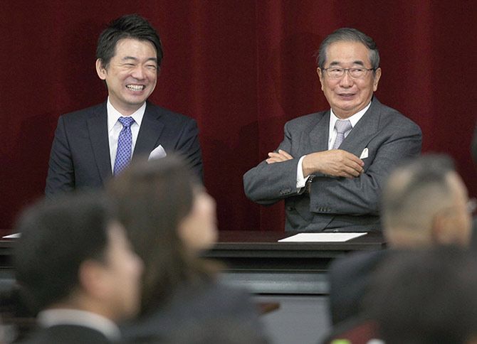 日本維新の会の全体会議で笑顔を見せる石原慎太郎氏(右)と橋下徹氏=2012年、大阪市(写真=時事通信フォト)