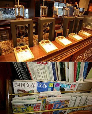 (上)本店にある「スチームパンク」の抽出機。(下)新聞や雑誌は読み放題だ。