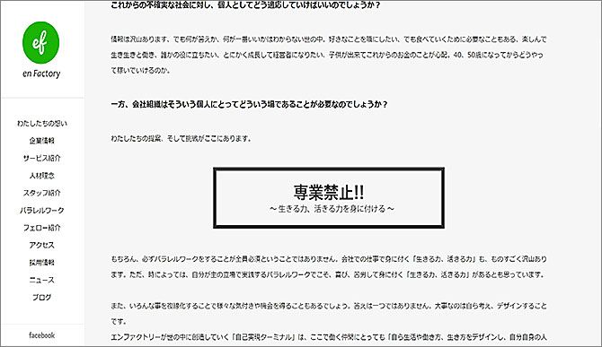 エンファクトリー社は公式サイトにも「専業禁止」と大きく掲げている