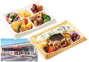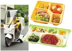 右上は「消化にやさしい食」(おかずのみ777円、ごはん付き820円)、右下は「普通食」。ごはんを左手に持って食べる習慣のある高齢者のため、ごはん容器を別にしている。ほか、歯の弱い顧客向けの「やわらか食」は、見た目の形を残して食感だけ特殊製法で軟らかくするなど、食べる楽しみにもこだわっている。