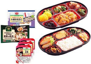 医師と管理栄養士監修のもと、カロリーの平均値や野菜や塩分の使用量に配慮して作られる、セブンミールオリジナルの日替わり惣菜は2種。写真左上は「すこやか膳」。日替わり弁当は3種で写真右下は「おまかせ御膳」。購入金額の合計が500円以上で配送料が無料になる(未満の場合は123円)。