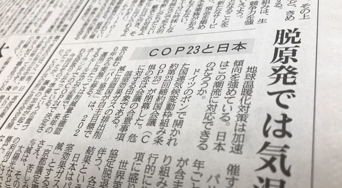産経新聞の社説「主張」(11月21日付)。見出しは「COP23と日本 脱原発では気温下がらぬ」。