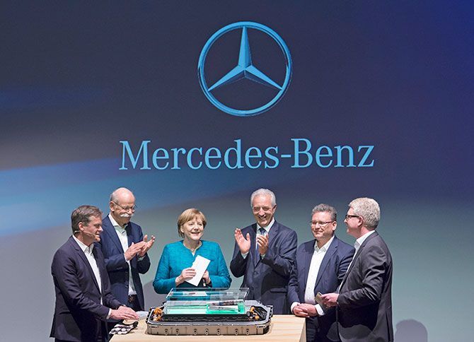 ダイムラーのバッテリー工場の起工式に出席したドイツのアンゲラ・メルケル首相(中央)とダイムラーの幹部たち。ドイツは国を挙げて、新工場を後押ししている。(写真=AP/アフロ)