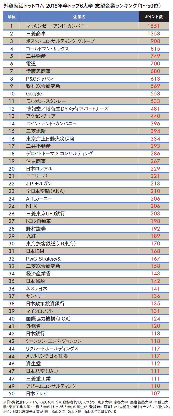 トップ6大学「就職人気企業ランキング」