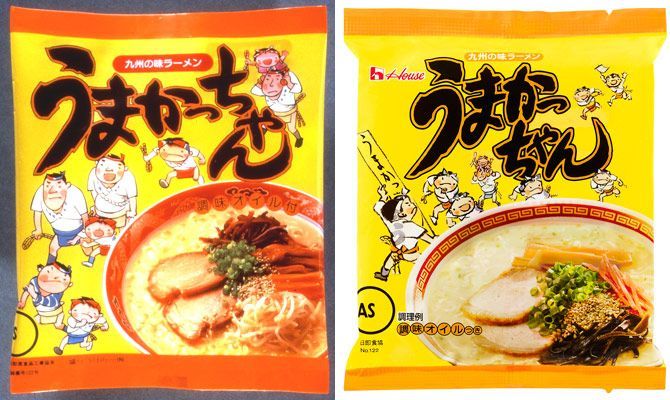 左は1979年発売当時の「うまかっちゃん」。味は変わらず、パッケージにも大きな変化はない。(画像提供:ハウス食品)