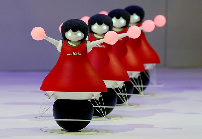 村田製作所が「CEATEC JAPAN 2017」で展示したロボット「チアリーディング部」。「倒れそうで倒れない」バランスと「ぶつかりそうでぶつからない」というチームワークがポイントだという。(写真=ロイター/アフロ)