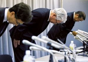 データ改ざん問題で会見し、頭を下げる神戸製鋼の川崎博也会長兼社長(写真中央、2017年11月10日)。(AFLO=写真)
