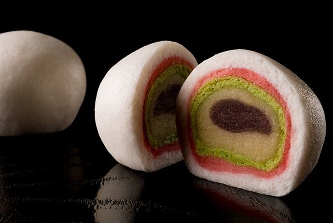 切ると五色の彩が表れる美しい断面。緑の部分も饅頭の皮で、一度、蒸しあげた饅頭を再度、あんと皮で包み仕上げていく。手のかかっている逸品だ。