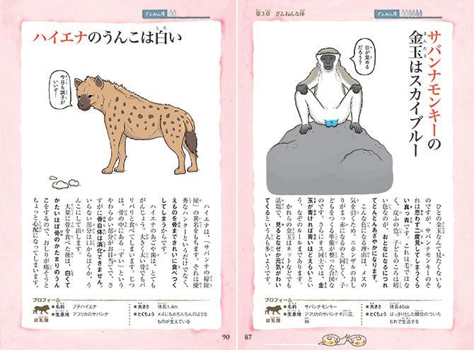 『続 ざんねんないきもの事典』では、子どもにウケる鉄板ネタとして、3ページに1つの割合で「うんこ」「おしっこ」ネタを配置(左)。さらに踏み込んだワードも使った(右)。