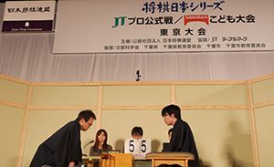 高学年部門の決勝戦は塩谷大暉君(八王子市立秋葉台小学校5年)対小雀悟君(横浜市立本牧小学校5年)。109手にて塩谷君の勝ち。低学年部門の決勝戦は北原優君(船橋市立前原小学校3年)対三好剛瑠君(川口市立戸塚東小学校3年)。74手にて北原君の勝ち。