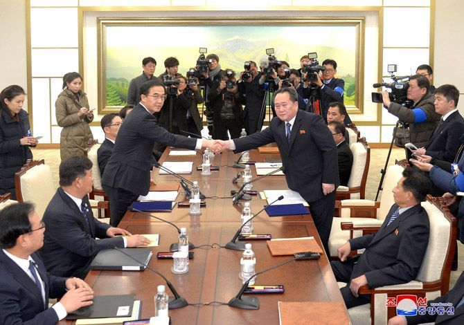 1月9日、板門店南側地域の「平和の家」で行われた北南高位級会談で南朝鮮(韓国)の趙明均統一相(左)と握手する祖国平和統一委員会の李善権委員長。(写真=朝鮮通信/時事通信フォト)