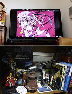 (上)東方ファンの作った二次創作アニメをユーチューブで見る(下)銀河鉄道999のグッズを部屋に飾る