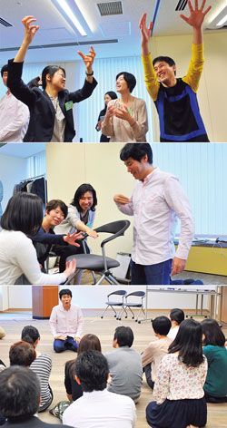 即興で場面を繋いでゆくゲームの数々を教わる(写真3枚とも)。自らアイデアを出そうと頑張るより、お互いに相手の言動を拾って次に繋げるほうがスムーズでアイデアも出る。