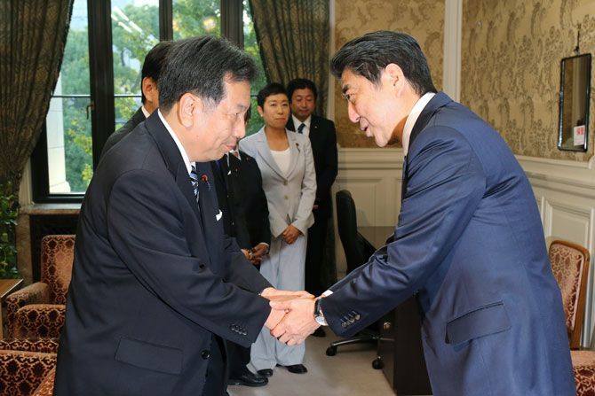 2017年11月1日、衆院本会議で首相指名を受け、あいさつ回りで立憲民主党の枝野幸男代表(左)と握手する安倍晋三首相。(写真=時事通信フォト)