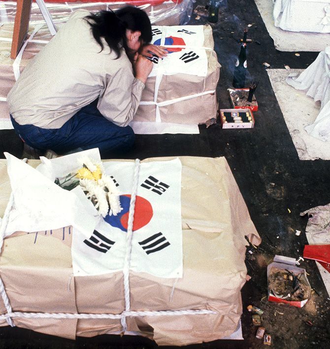 学生デモと治安部隊の衝突がエスカレートし、数千人の死傷者を出す大惨事に――。1980年5月の光州事件で、犠牲者の棺に寄りかかって泣く女性(FRANCOIS LOCHON/GAMMA/アフロ=写真)