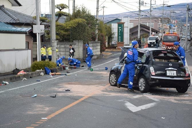 女子高校生2人がはねられた事故現場を調べる捜査員=1月9日、群馬県前橋市(写真=時事通信)