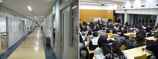 (左)東京都市大学等々力中学の校舎内。がらんとした廊下。この中で入試がおこなわれている。(右)子供が試験中、保護者は控室に。一番前に試験問題が掲示されている。