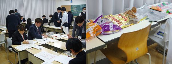 (左)社会採点現場。答案が持ち込まれ、いよいよこれから作業。(右)採点現場の隅には教員用の夜食が置かれていたが、誰一人食べていなかった。