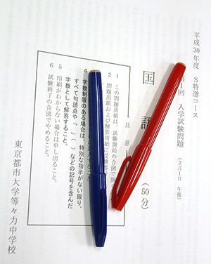 採点は必ず1人が1度チェック。そのため青ペンと赤ペンが必要だ。