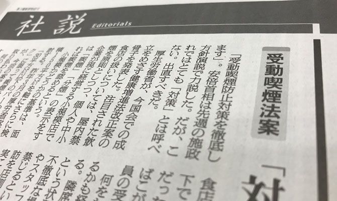 朝日新聞の社説(2月1日付)。見出しは<受動喫煙法案「対策を徹底」はどこへ>。