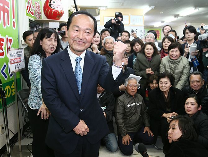 2月4日、名護市長選挙で当選確実となり、ポーズを取る渡具知武豊氏(写真=時事通信フォト)