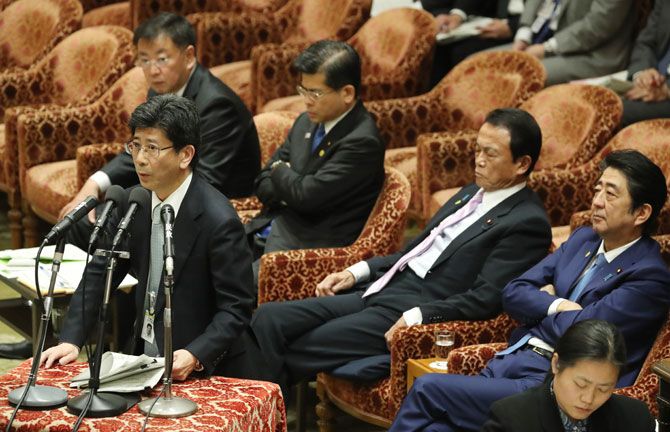 2017年2月、衆院予算委員会で答弁する財務省の佐川宣寿理財局長(左、当時)。右端は安倍晋三首相(写真=時事通信)