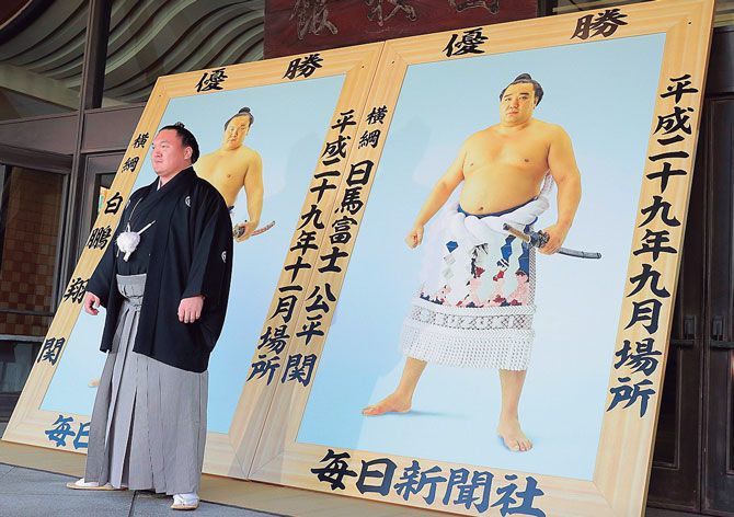 元横綱・日馬富士が不在の優勝額贈呈式。左は横綱・白鵬。(時事通信フォト=写真)