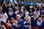 韓国・江陵の関東アイスホッケーセンターで、統一旗を振る北朝鮮の「美女応援団」(写真=AFP/時事)